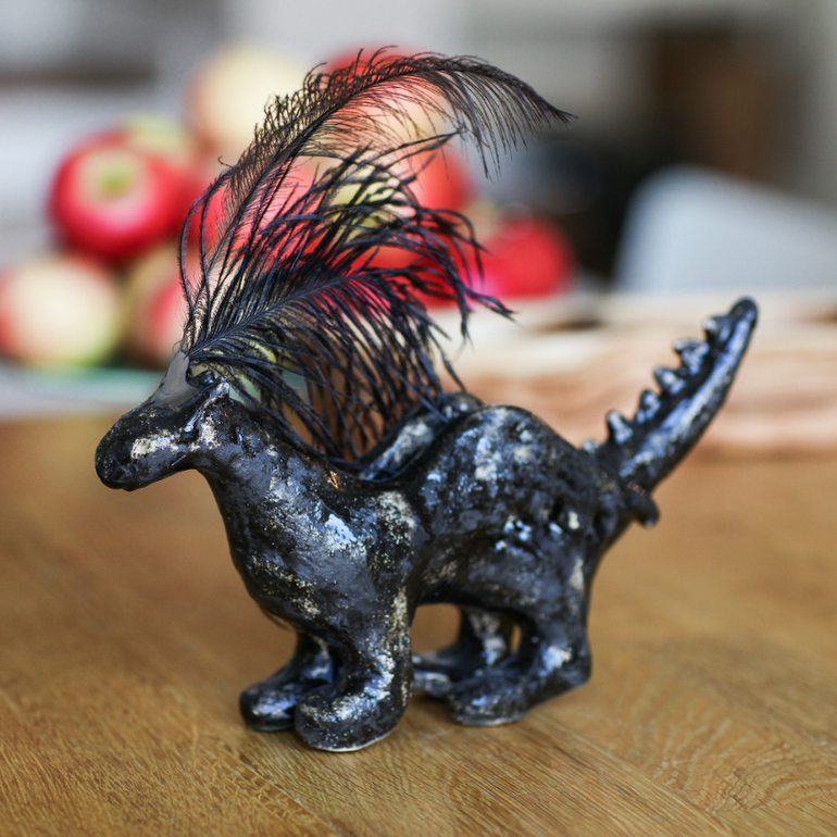Итоговый Беззубик живет у нас на полке. На страусиной ферме мы нашли ему украшение))