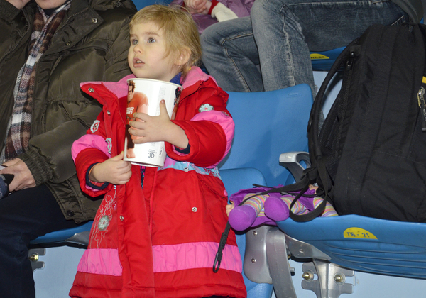 В представлении участвовали и начинающие фигуристы - совсем маленькие детки, очень забавные и умилительные (вот такое слово подходит, да))) Был и сюжет, и отличные спецэффекты, и здорово подобранная музыка, и акробатические номера. Понравилось и то, что за время представления (часа 1.5 в общей сложности) детки переоделись раза 4 полностью! И все так четко, без заминок. Взрослые фигуристы, конечно, держали в напряжении своими поддержками, тулупами, сальто через друг друга и воздушной акробатикой. Очень профессионально, красиво, с виду легко. Где-то в середине Влада спросила: "ма, а чтой-то мы сидим, пошли тоже туда кататься", и активненько так засобиралась вниз)))) Пришлось обещать коньки.