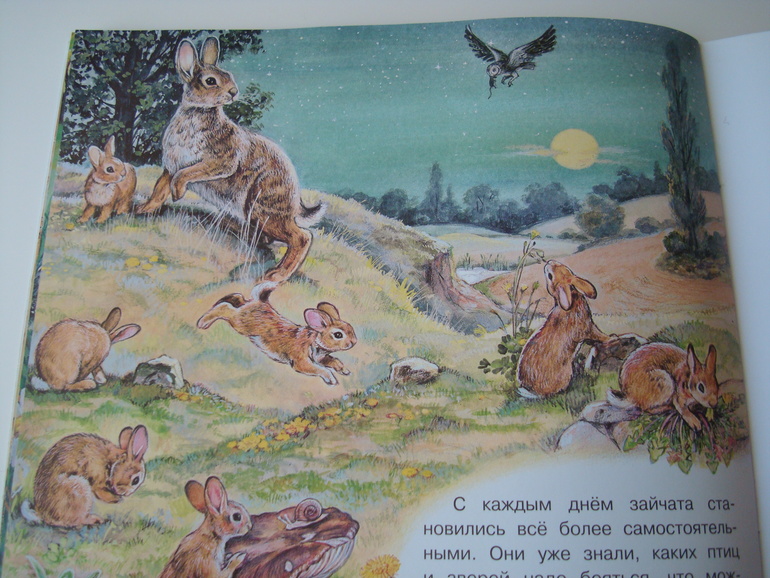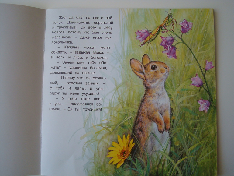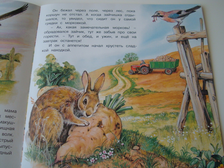 В "зайчонке" очень хорошие иллюстрации. Качество самой бумаги тоже очень хорошее, не смотря на смешную цену (покупала в "Интеке" за 35 р). Бумага гладкая очень приятная на ощупь, как в дорогих книгах, запах от страниц книжный, не вонючий. Текст очень простой, понятный для малышей. Прокол только в одном месте, я не поняла почему морковь изобразили какую-то странную. Это на мой взгляд. А вот и фото: