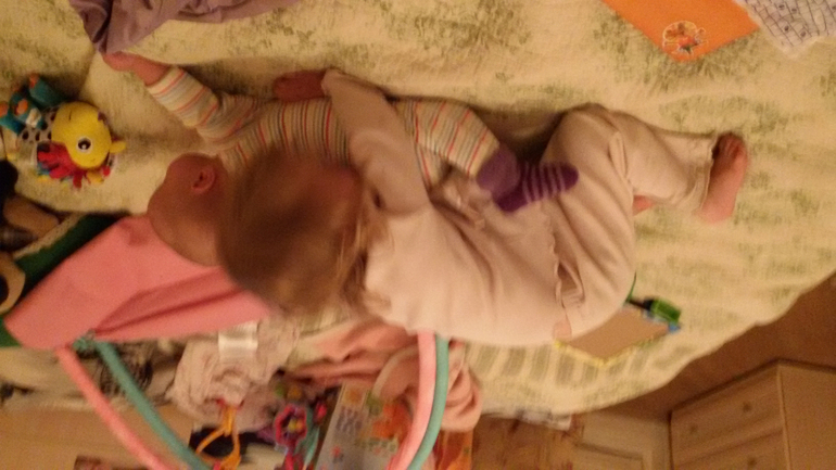 Много играет с Олей, уже целенаправленно хватает ее игрушки и смеется. Пришлось обработать Олю на тему, что это очень здорово, сестра развивается и готовится к полноценной игре. Конфликт обошли)