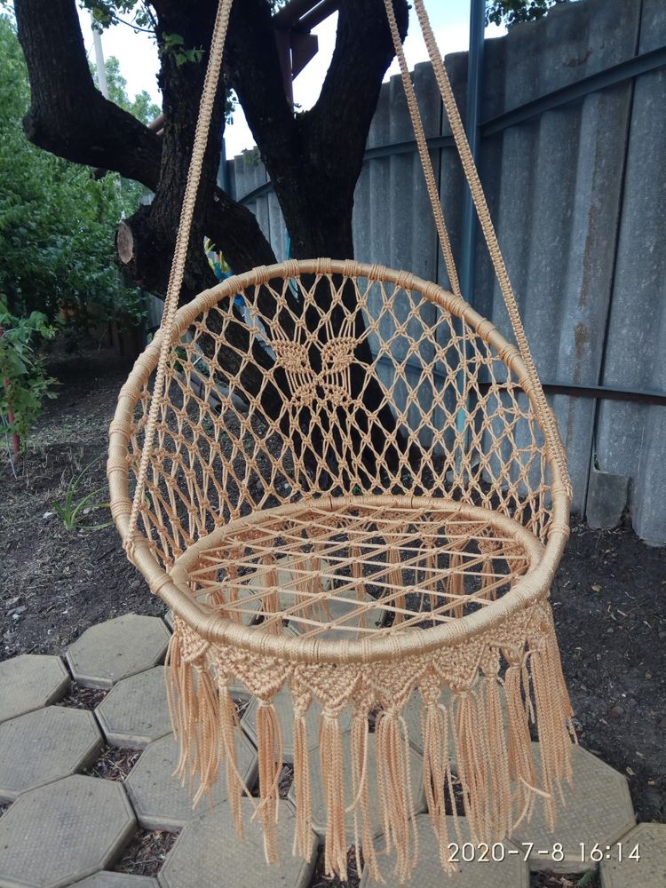 Всем привет! Для работы использован шнур полипропиленовый с сердечником, диаметром 4 мм. Цвет "Желтое золото". Всего понадобилось 400 м. шнура. Диаметр кругов кресла: сиденье - 70 и спинка 70*80 см. Погнули самостоятельно. Приварили кольца друг к другу. Далее кольца обязательно покрасить, чтобы они не ржавели. Время выполнения - 3 дня