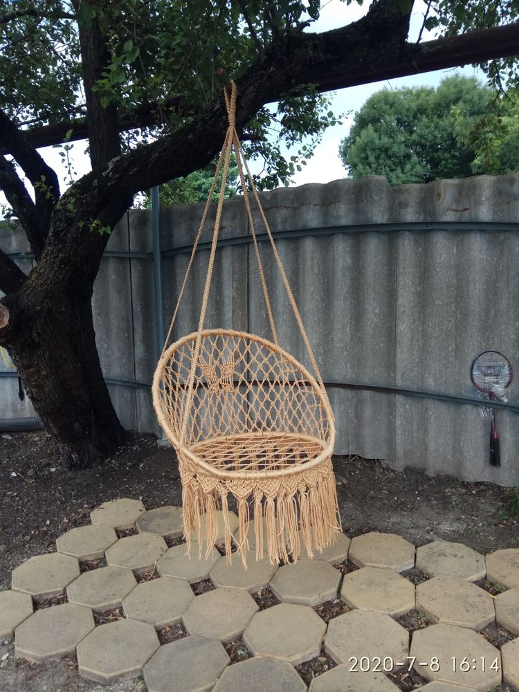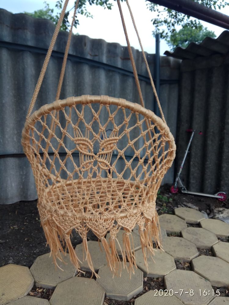 Для работы использован шнур полипропиленовый с сердечником и без, диаметром 4 мм. Цвет "Желтое золото". Всего понадобилось 400 м. шнура (200 с сердечником и 200 без). Диаметр кругов кресла: сиденье - 60 и спинка 80 см. Погнули самостоятельно. Приварили кольца друг к другу. Далее кольца обязательно покрасить, чтобы они не ржавели. Время выполнения - 3 дня
