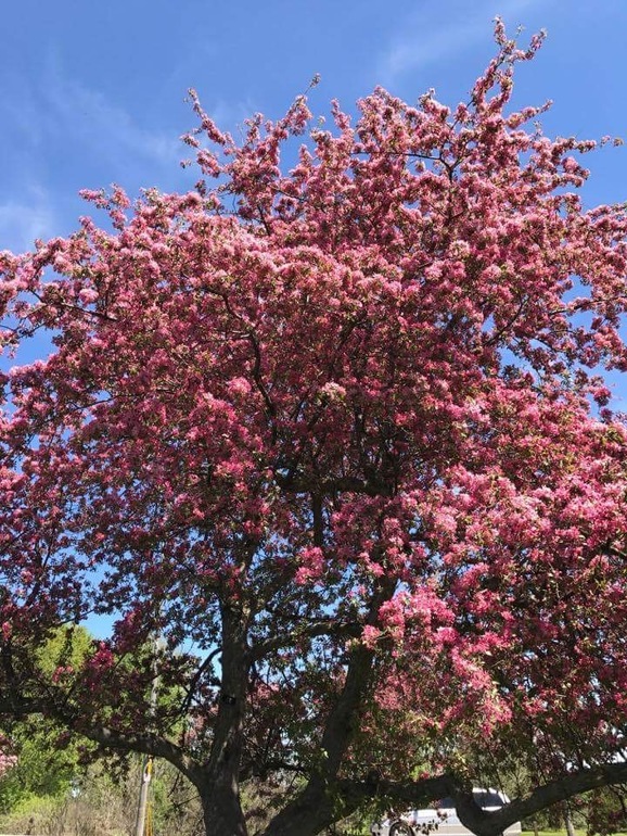 Такие розовые розовые яблони с мелкими-мелкими яблочками, почему-то здесь они кажутся необыкновенно яркими, может быть, из-за яркого неба