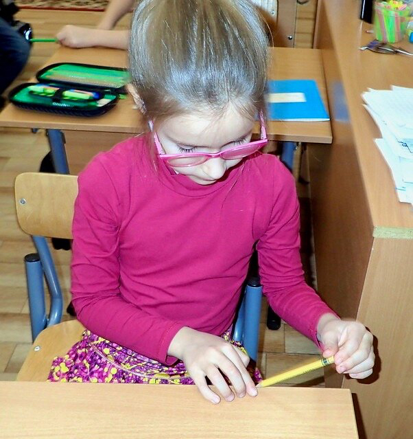 У кого-то длинный карандаш, у кого-то маленький - результаты получаются разные. Потом начинаем измерять счётными палочками. А потом берём 10-сантиметровые палочки, дециметры - из любимого набора base ten, и при помощи этих палочек измеряем доску, парту и тп.