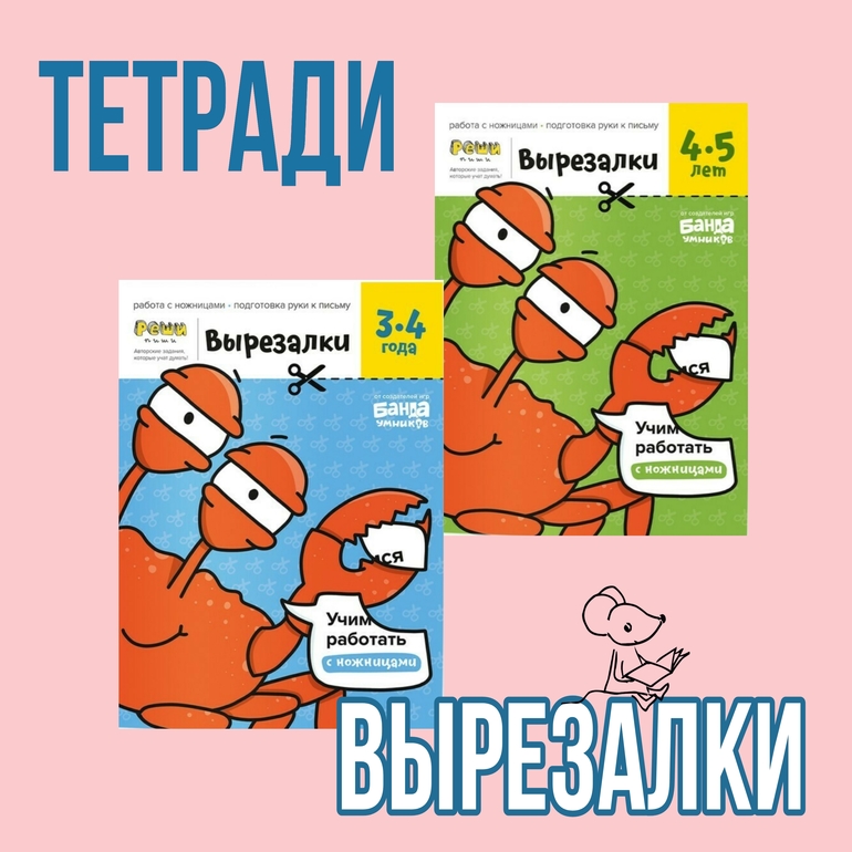 Научиться уверенно держать ножницы помогут тетрадки от Банды Умников "Вырезалки, 3-4 года" и "Вырезалки, 4-5 лет". Задания расположены в порядке" от простого к сложному", и сперва ребёнок научится делать простые прямые разрезы и разрезы с плавными изгибами, а уже потом что-то посложнее.