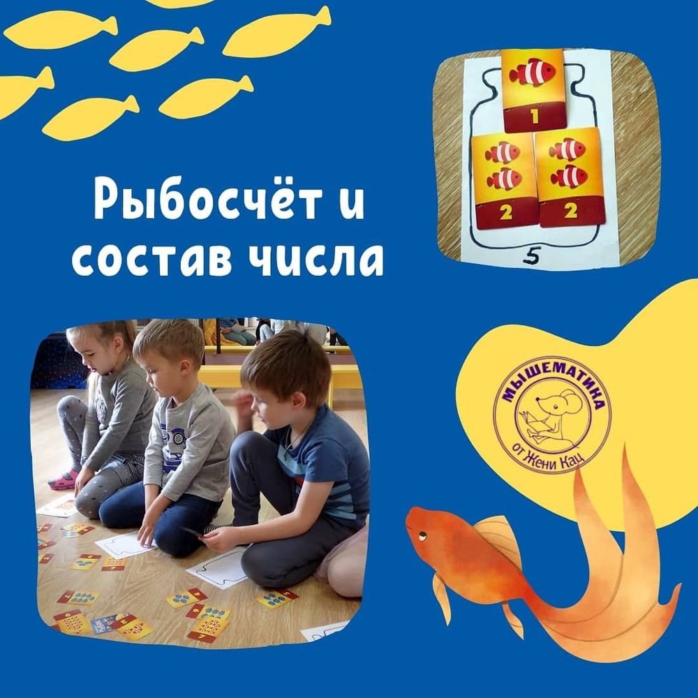 А ещё с рыбами очень здорово получается изучать состав числа. У каждого ребёнка есть по пустой банке, на которой написано число - столько рыб в неё нужно запустить. На полу вперемешку лежат карточки с разным количеством рыб, и нужно наполнить свою банку несколькими разными способами