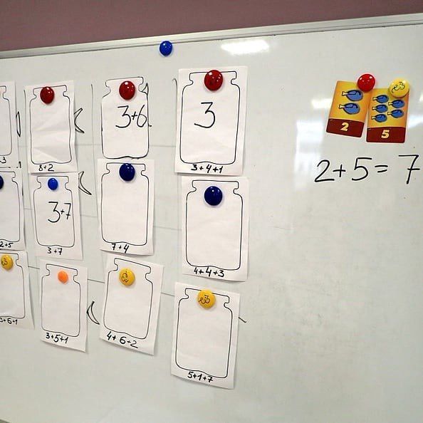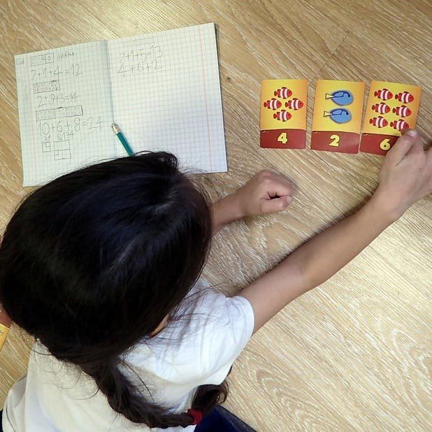 Складывать карточки в банку, которая лежит перед тобой, довольно просто. Куда сложнее, когда банки висят на доске и написано на них не полное количество рыб, а сумма. Глядя на неё, ищешь нужные карточки и считаешь, сколько всего