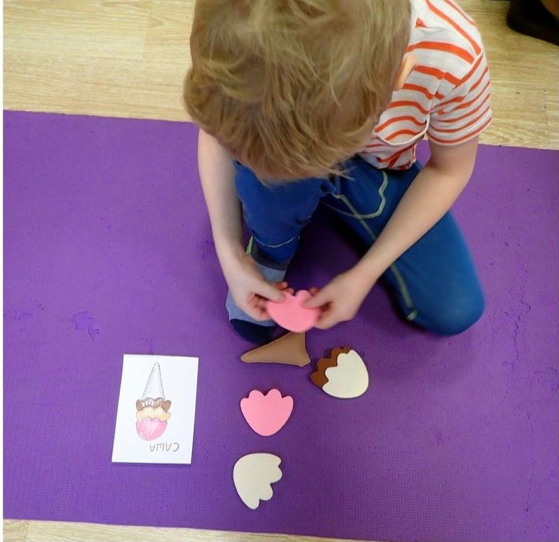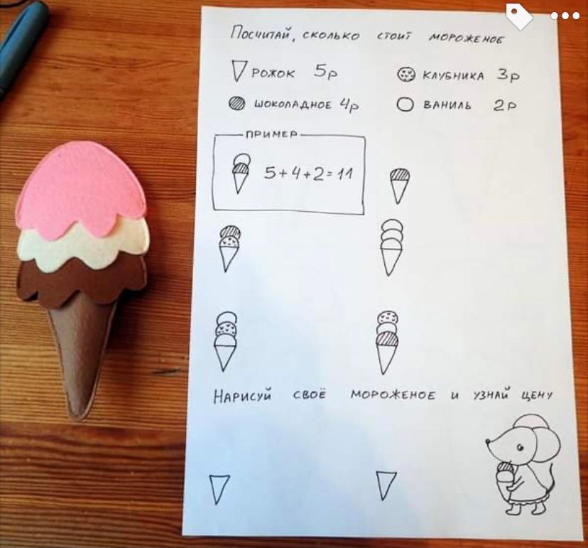 У нас есть замечательные фетровые детали, из которых можно собрать отличное разноцветное мороженое, руководствуясь схемой, или считать его стоимость, исходя из стоимости шариков с разными вкусами. Дети счастливы, а мороженое получается такое, что слюнки текут!