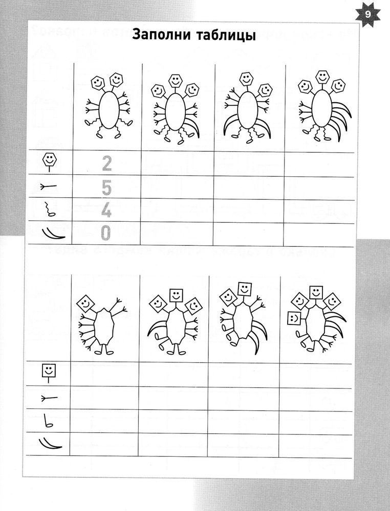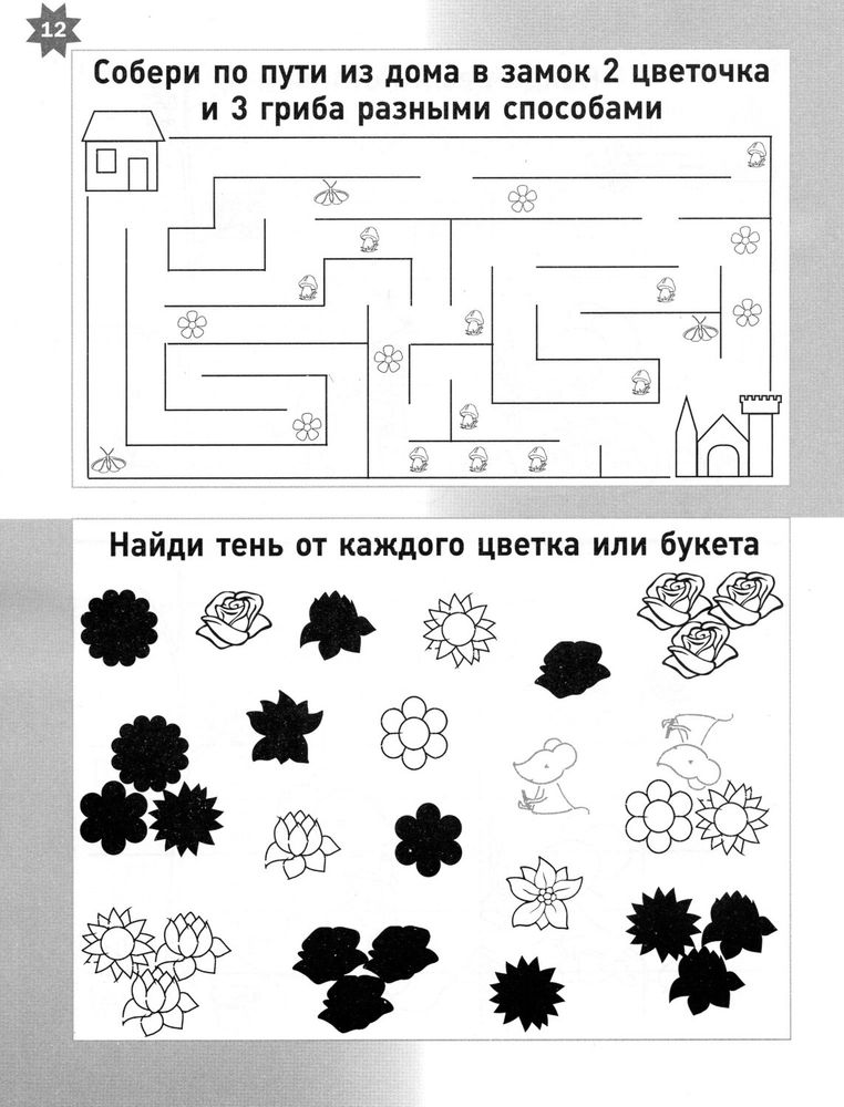 Задания в очень разные: от «раскрась одинаковые картинки одним цветом» или «раскрась половину вагончиков один цветом, а другую половину другим» до прохождения лабиринтов, поиска фигур по тени и заполнения таблиц с количеством рук, ног и голов забавных монстриков. Ну и конечно, в тетрадке также много цветочных заданий про божьих коровок и красоту. Весна же ☺️