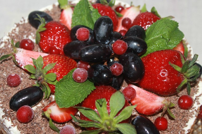 Состав там такой : шифоновый бисквит пропитаный молочно земляничным сиропом, сметанный крем ванильный, кусочки свежей клубники, украшала клубникой, виноградом, брусникой и листьями мяты