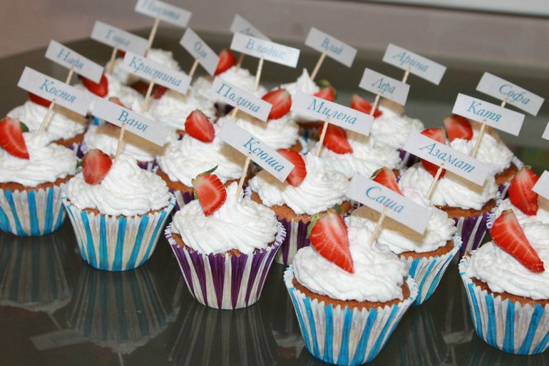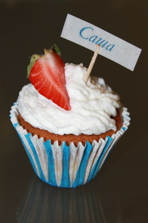 Заказик в школу на выпускной :) Тортик шифоновый бисквит, сметанный крем с кусочками клубники и оформлен мокрой меренгой. Кап-кейки ванильные с вареной сгущенкой, мокрой меренгой и клубникой