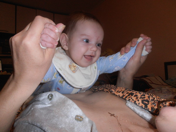 Младшенькая уже умеет ловить свои ножки, хватать подвешенные игрушки, заливисто хохочет, когда ей делаешь "ладушки", что-то лопочет без умолку на своем тарабарском языке...
