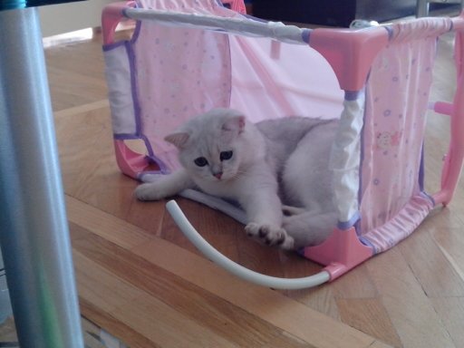 Хотим найти подружку. Как и все британцы не любит сидеть на руках, но если взять на руки будет терпеть (определенное время). А так очень лояльный котик. Маленькая любит катать в коляске, а котик и не упирается. Также лежит в кроватке для кукол.