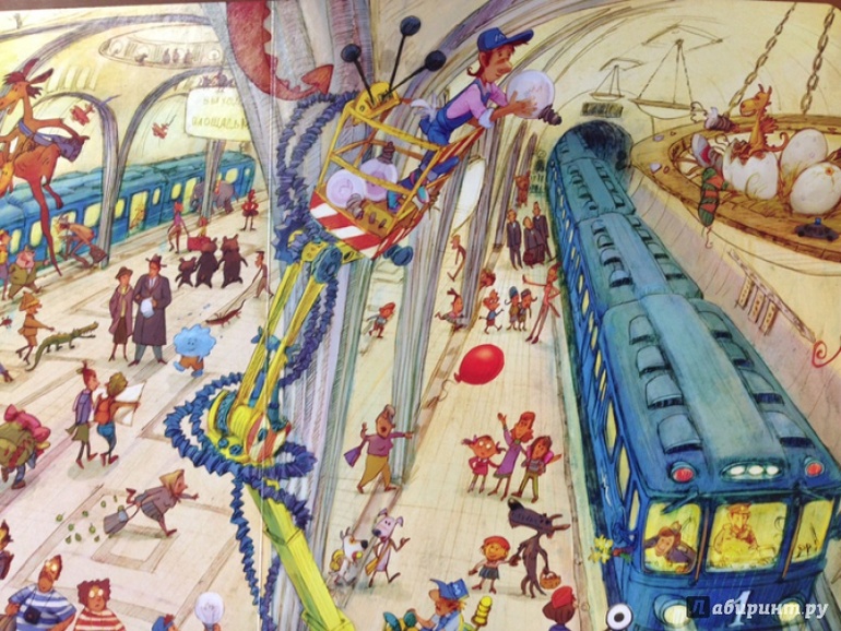 2) Храмцов, А. Метро.- М: Издательский дом Мещерякова, 2016.- 18 с. Ну это просто книжка-телевизор. И да - размер имеет значение. Особенно для виммельбуха. Степень моего ужаса от книги формата In folio оказалась прямо пропорциональна градусу восторга ребенка, раскладывающего ее на большой подушке с видом картографа. Отличный вариант для того, чтобы занять и отвлечь ребенка на непродолжительное время и неплохая основа для сочинения историй: книга просто кладезь смешных персонажей и очаровательных несуразиц.Одни только драконьи яйца на станции, напоминающей «Маяковскую» и сидящая в аквариуме дежурная по эскалатору чего стоят.
