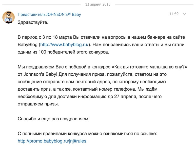 На ББ часто проходят различные опросы, промо-акции и тест-драйвы. Мы конечно участвуем не во всех, но вот весной прошлась я по ссылочке http://promo.babyblog.ru/jnj (сейчас там уже нечто другое...)где проходил обычный опрос как мы укладываем нашу малышку. Рассказала, и забыла, а позже получила личное сообщение от Представителей Johnsosn's baby http://www.babyblog.ru/user/lenta/motorinpr