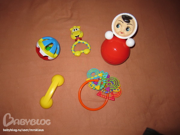 ИгрушкиДевоньки... Вообще мой пирожок игрушки как-то не очень и любит, ему интереснее подергать маму за волосы и нос, оторвать шторы с карниза, стаскивать скатерть со стола. Но в последнее время игрушки нас стали занимать все больше и больше.... И тут меня посетила какая-то не радужная мысль что у нас их недостаточно ... Хотя мой маман, он же любимая БАБА утверждает что в них можно утеряться по самою тыковку... В общем выкладываю на ваш суд и размышления наши запасы. Буду признательна за полезнае советы, в том числе и самодельных игрушек-развивалок.