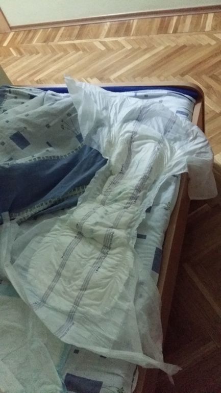 Подняли в отделение. Решаю поспать немного. В 4 утра начинаются толи схватки,толи че) во сне их продышиваю.... где то в 7 утра проснулась. Решаю походить,чтобы раскрытие быстрее пошло... но ходить лень,да и мама купила мне памперс размера хххххххл😂 спадывает с меня. Вот он кстати....