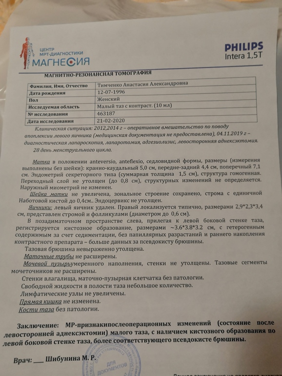 Удалён уже левый яичник и труба 4 операции по кистам и опендикс удалён, все в спайках, врачи говорят пей тоблетки противозачаточные, я уже не могу их пить толку нет все ровно что-то да ни так! Вот ходила на мрт результат, ничего не понимаю может кто что подскажет, поможет!