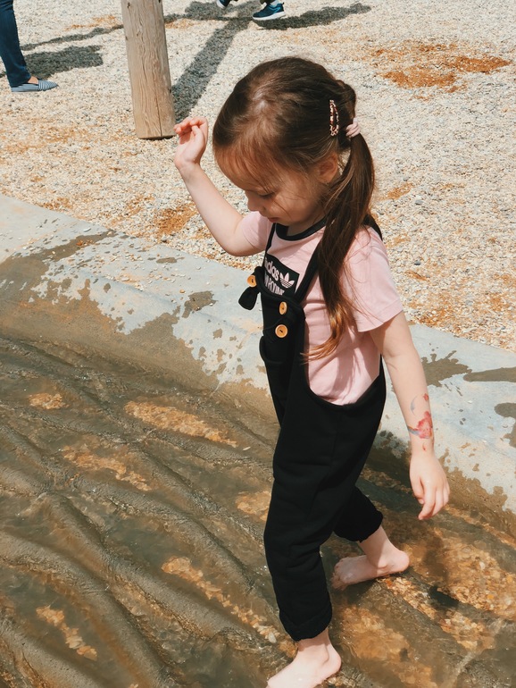 Больше всего нам понравился настоящий ручей, с плотинами, где дети могут сами регулировать уровень воды, направление и скорость потока, запускать кораблики, играть водными пистолетами и бегать босиком, прохлаждаясь в жаркие летние дни. Отдельно, моя личная благодарность конструкторам-проектировщикам, которые сделали дно ручья не ровным-ортопедическим! Я сняла Еве обувь и пустила ее бегать босиком по воде, забыв о времени на долго.