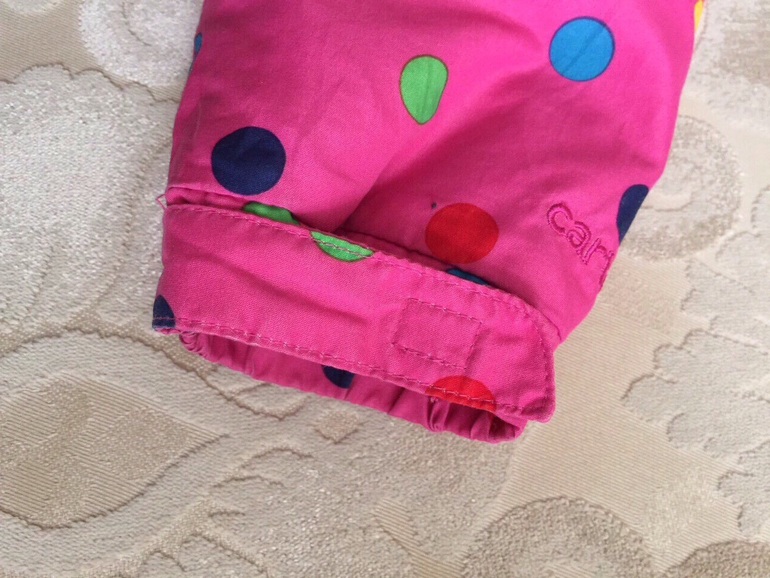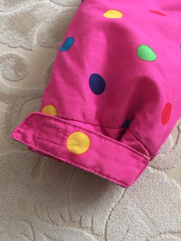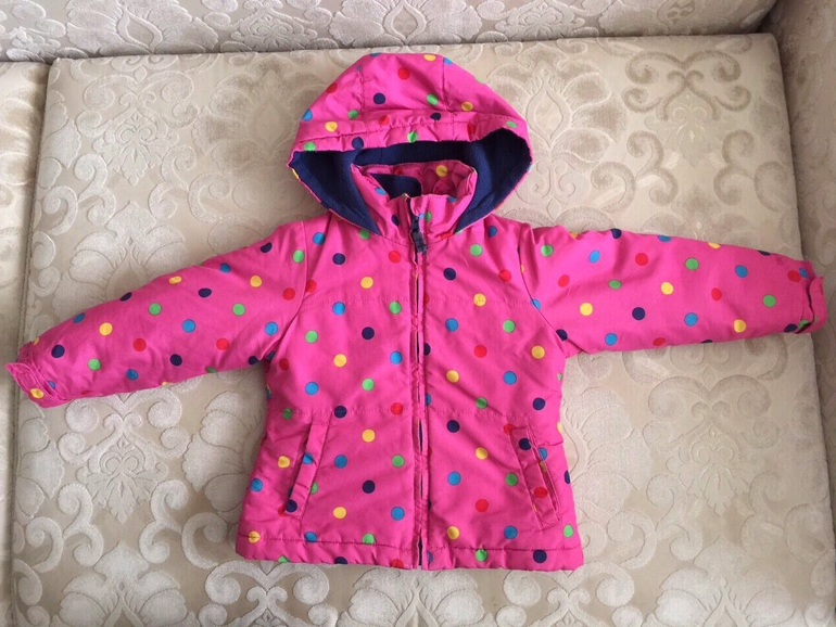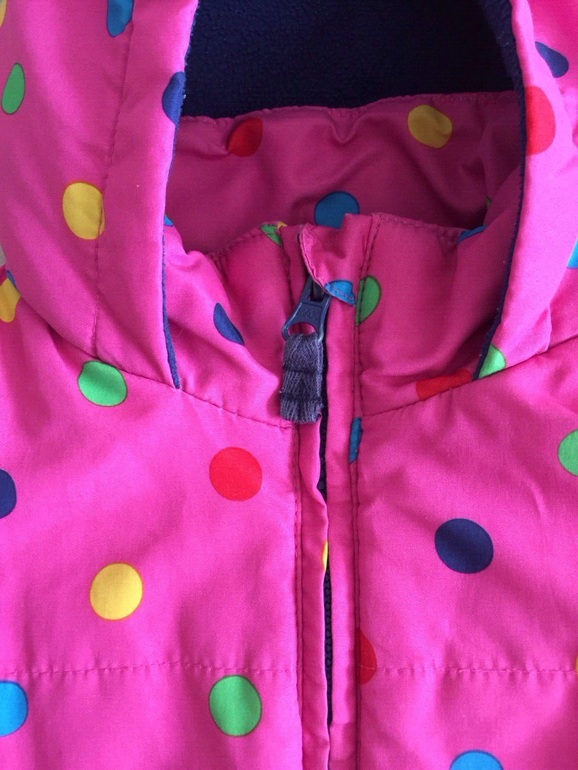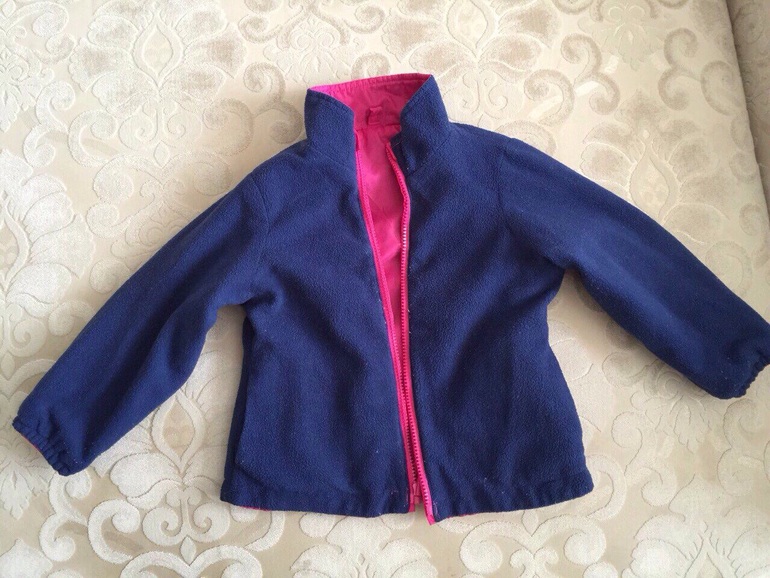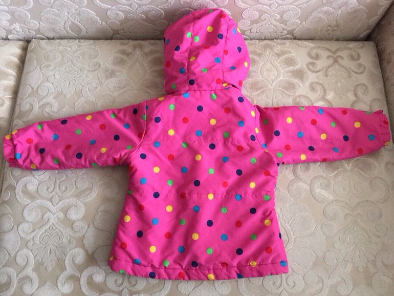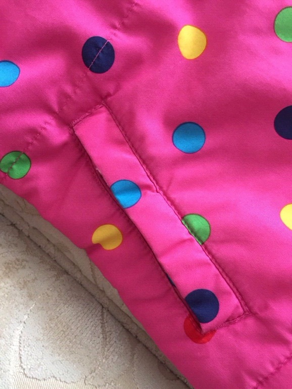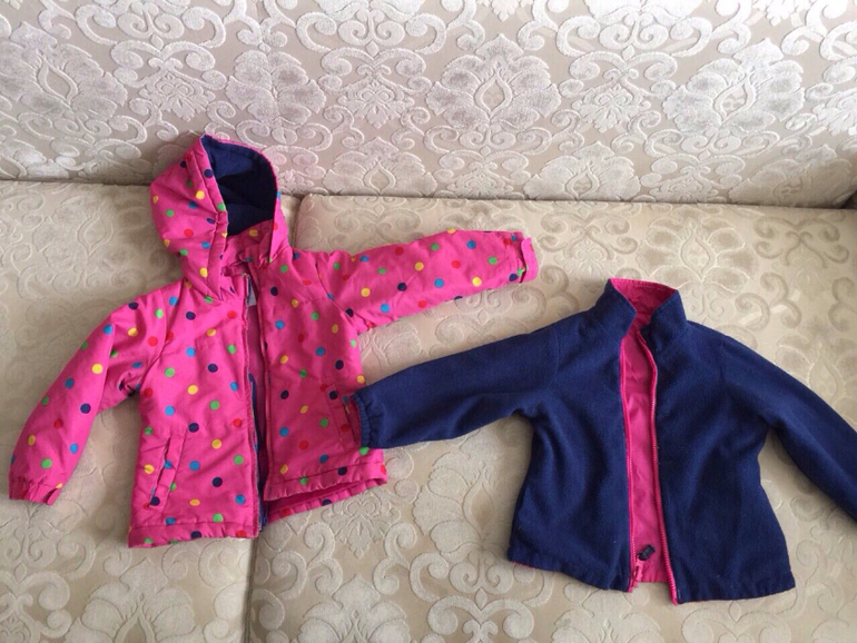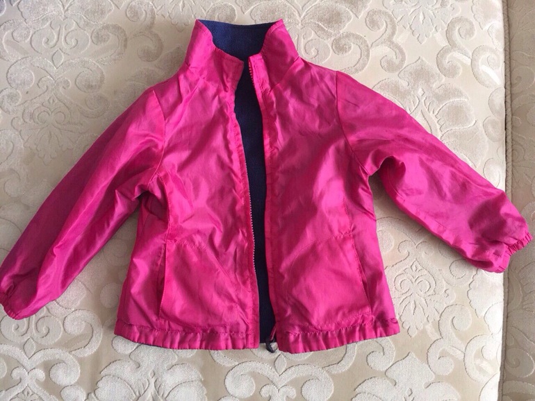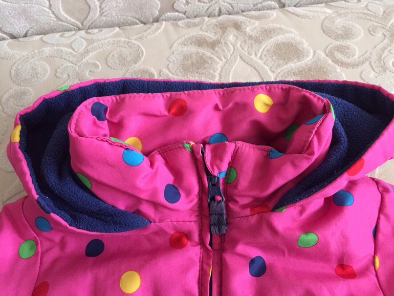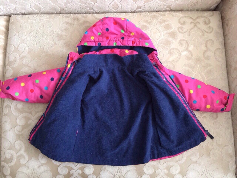 Куртка теплая, есть двусторонняя яркая подстежка, которую можно носить отдельно как ветровку той стороной, которая больше нравится. Материал водонепроницаемый, наполнитель-синтепон. Двухстронняя флисовая подстежка пристегивается к верхней куртке с помощью молнии. Верхнюю курточку можно одевать без подстежки, как демисезонную.