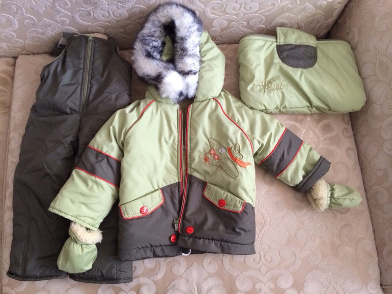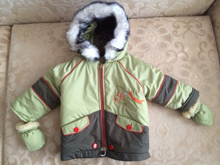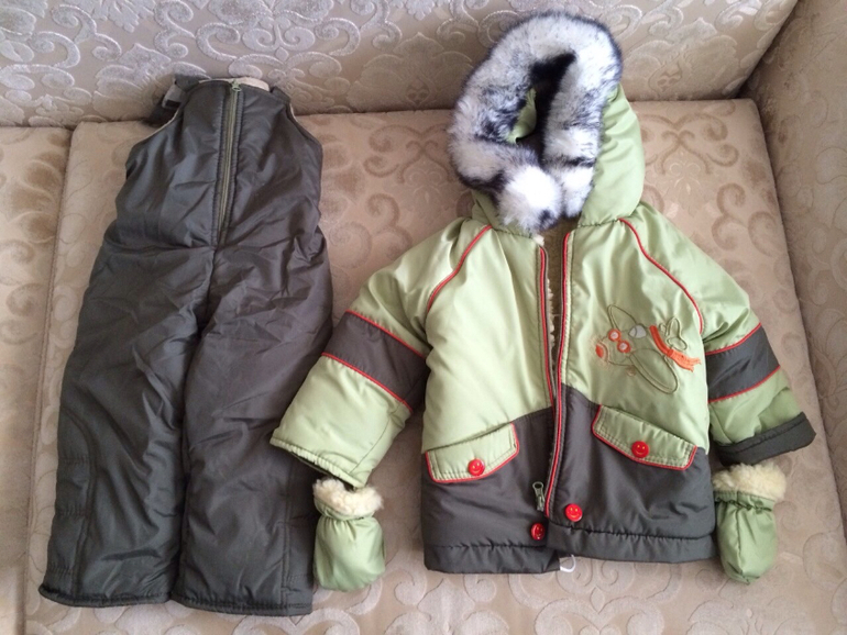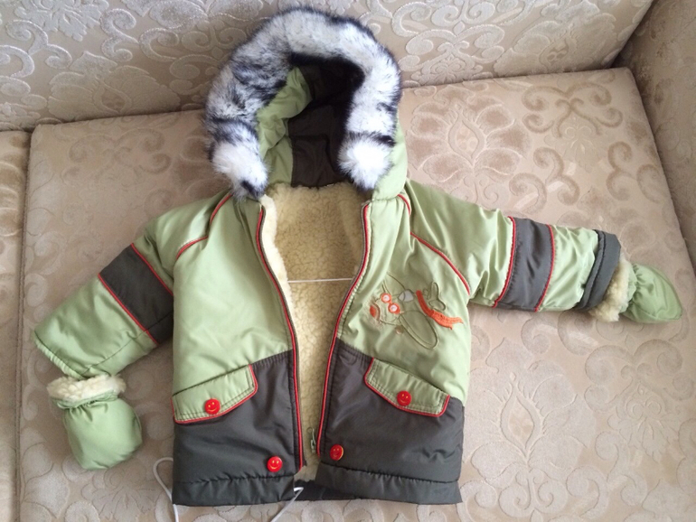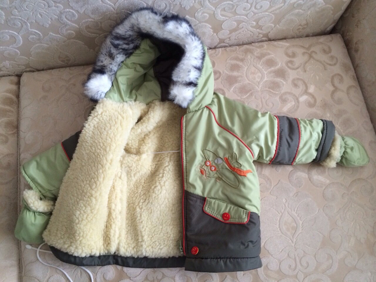 Штаны на синтепоне с флисовой подкладкой. Куртка на овчине с капюшоном. В комплекте варежки на веревочке. 4000р