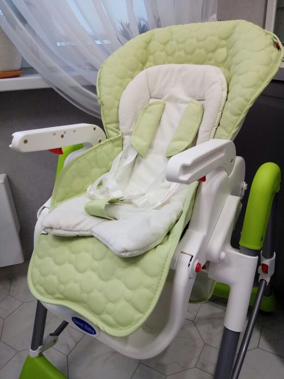 Сиденье сделано из экокожи, приятная на ощупь и достаточно плотная, кстати легко моется, достаточно влажной тряпочкой пройтись и снова первозданная чистота. Для малышей мягкий вкладыш. И конечно, ремни безопасности, чтобы ребенок не смог улизнуть из стульчика.