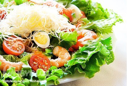 Выложить на блюдо листья салата, вареные креветки, помидоры черри, яйца и посолить.