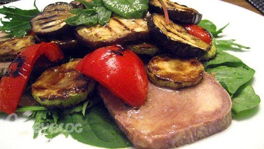 На порционные тарелки выложить салат, язык, на него овощи-гриль, затем шампиньоны. Заправить соусом, посолить, поперчить.