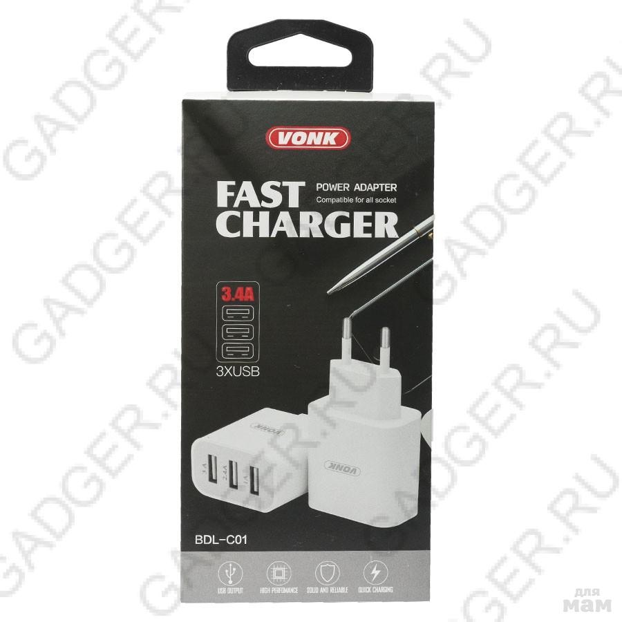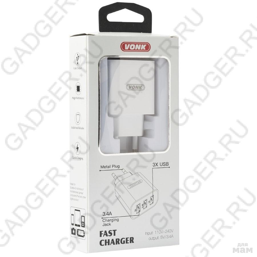 Зарядное устройство с 3 портами USB. Корпус сделан из пластика, с хорошими показателями ударопрочности и термостойкости. Модель идеальна для использования дома, в офисе или в поездках. Для начала работы нужно подключить к СЗУ любое USB-совместимое устройство. Позволяет одновременно заряжать три устройства.Может заряжать: телефоны, планшеты, плееры, игровые приставки, фотоаппараты и т.д. Обладает встроенной защитой от перезаряда.