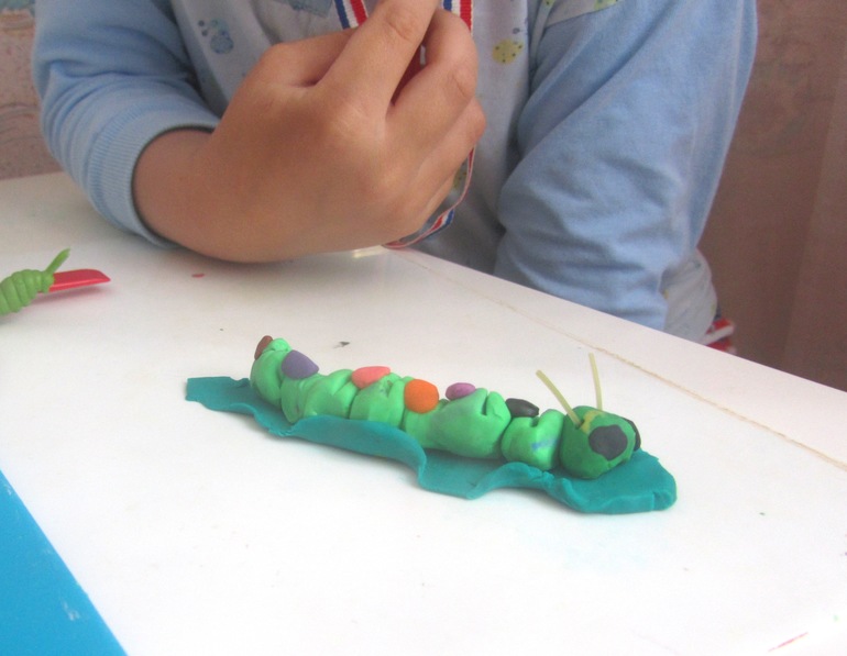 Кирилл слепил замечательную гусеницу, проявил инициативу и украсил ее разноцветными кружочками и сделал поперечные полоски ножом.. Бабочки у нас получились очень радужные, экспериментировали с цветом. И остались очень довольны результатом, несмотря на то, что перевели весь пластилин в доме.. А за кадром остались еще несколько бабочек.