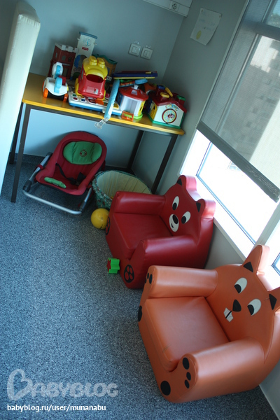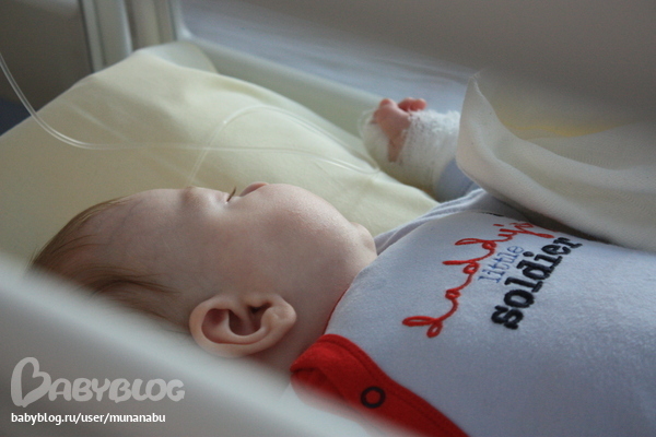 Вечером несколько раз приходили разные медсотрудники и говорили, что на следующий день мне надо не кормить после 8 утра, т.к. в 11 будут чистить всю поврежденную кожу под наркозом, молоко давать нельзя. Вот отсюда и началась вторая волна неприятностей. В 7-30 мы покормились последний раз. Вместо 11, увезли Тимошку лишь в 14 часов. 6 часов без еды. Я не знаю, как мы оба это выдержали. Медсестры успокаивали, что он под капельницей, поэтому не голодает, но Тима так несчитал. Уже после 16 часов меня пустили в послеоперационную покормить ребенка. Комната, где детки отходят от наркоза вся увешена игрушками, рисунками, висит 2 плазмы с мультиками.