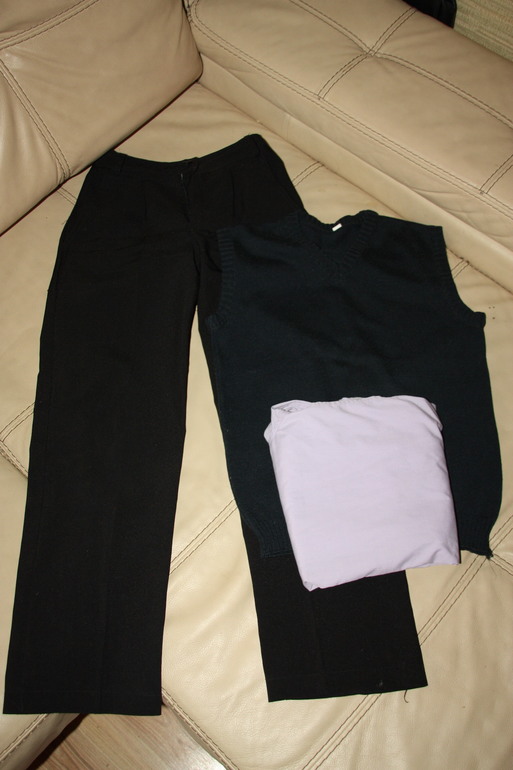 Отдадим школьный комплект для мальчика на рост 134-140 см., брюки черные в хорошем состоянии, только надо зашить по шву между ног, жилетка темно синяя в очень хорошем состоянии, рубашка в хорошем состоянии. Также предлагаю форму для айкидо и других единоборств на рост 124 см(два кимано и одни брюки, немного покрасились при стирке.)