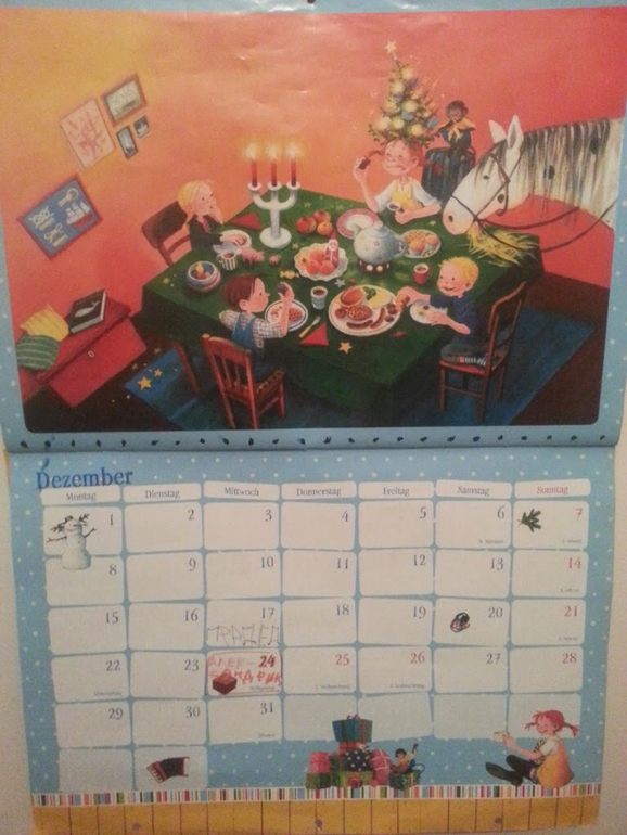 Просыпается и вдруг вспоминает, что уже декабрь, пора перевернуть календарь (этот с Пеппи заканчивается, следующий, судя по всему, будет с Петсоном и Финдусом):