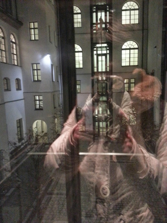 Лифт в образовательном центре без зеркала. Поэтому такое абстрактное селфи:
