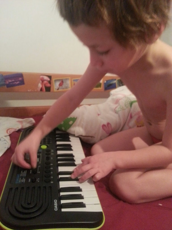 Потом вспоминает, что вчера на музыке ей дали синтезатор: