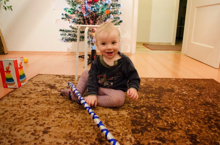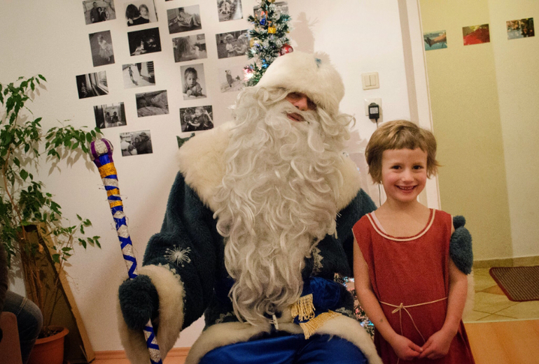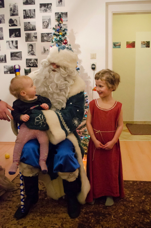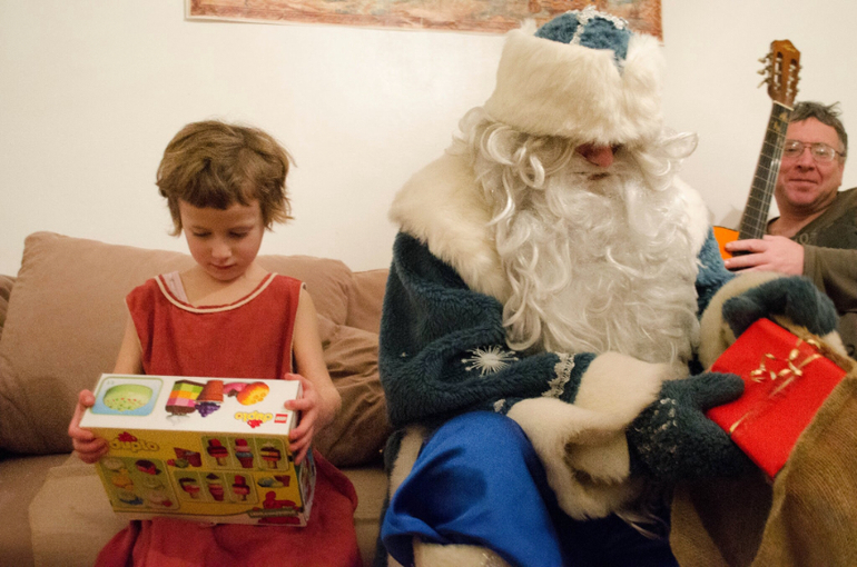 Дениза рассматривает свой подарок, а Дед Мороз прячет свой. Дениза потом мне сообщила, что в подарке для Деда были картинки: