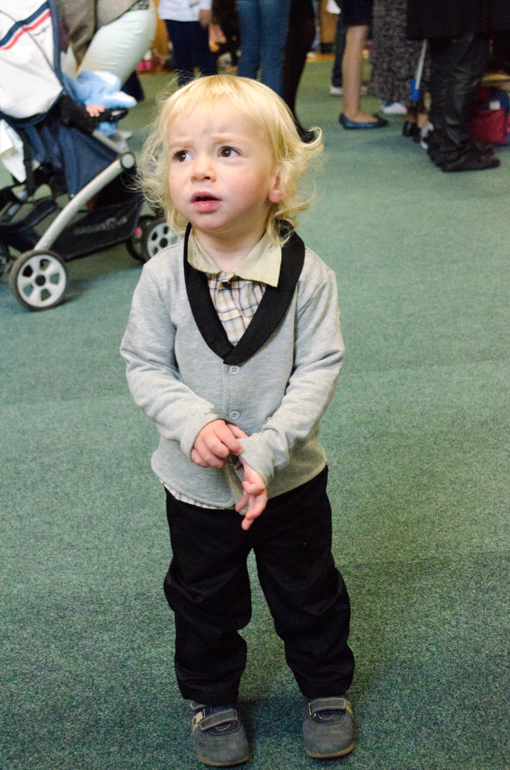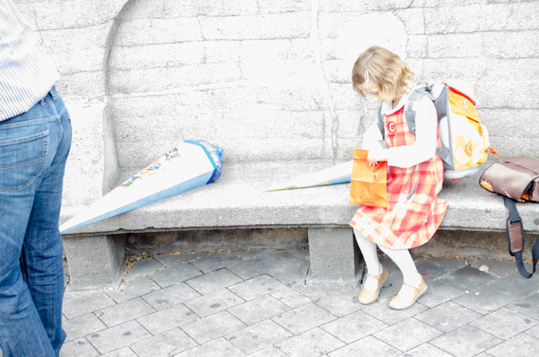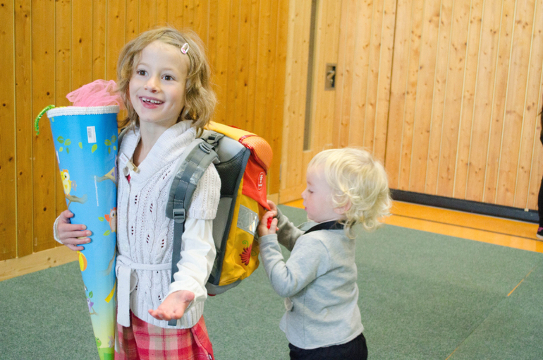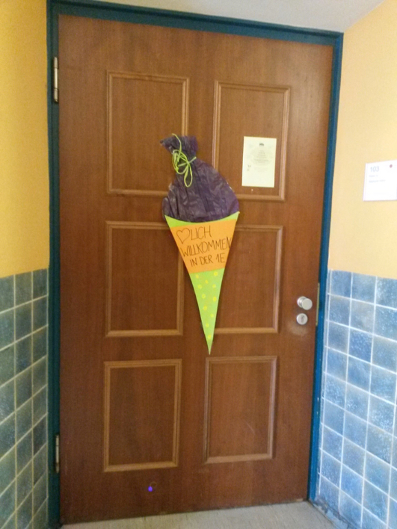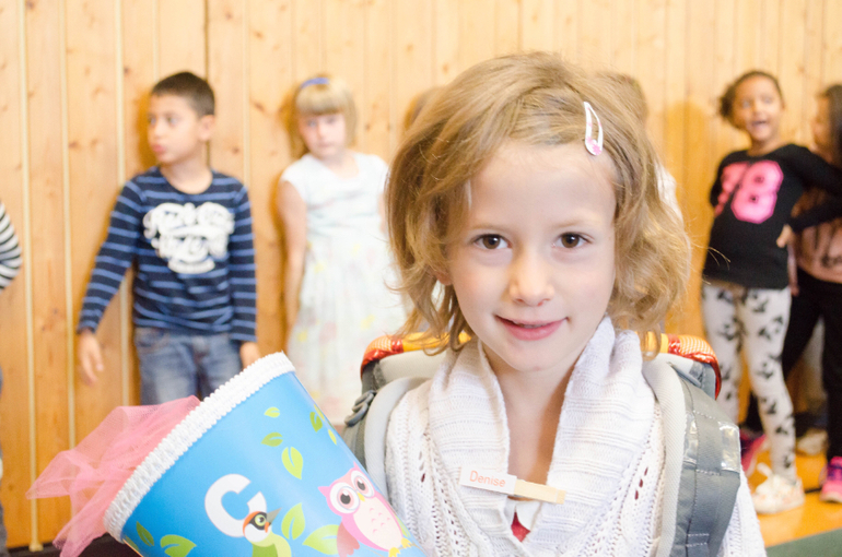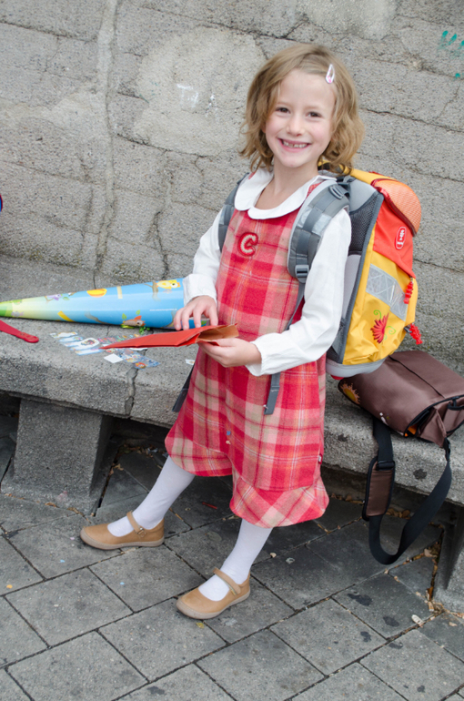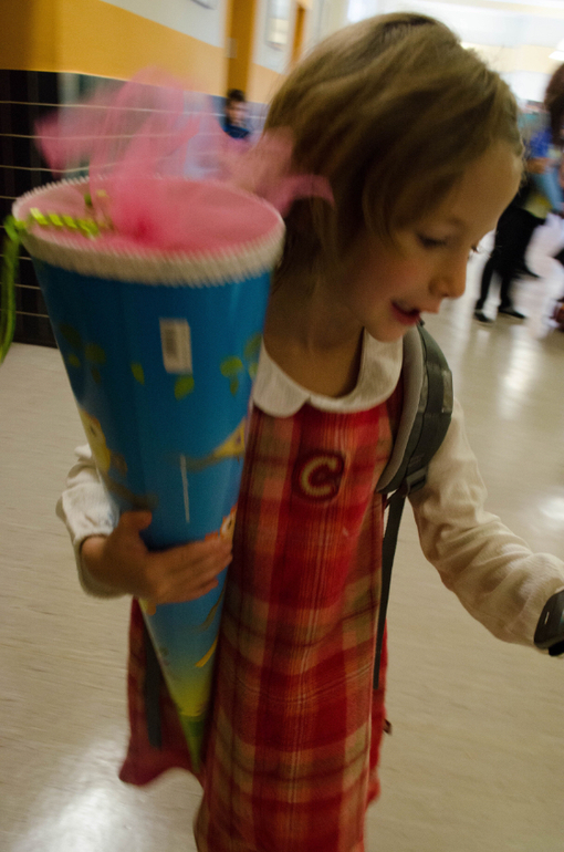 Линейка состояла в коротком приветственном слове ректора и песнях-плясках второго и третьего классов. Линейкой я ее тоже называю условно, потому что в линейки на самом деле никто не строился. Дети сидели на скамейках, родители стояли, младшие дети лазили по лестницам и бегали. Потом представили учительниц младших классов. Наша - фрау Хам (по версии Денизы; мне послышалось "Ламм") новенькая в школе и самая молодая из пяти. Дети по очереди подходили к учителям в сооветствии со цветом имени на прищепке, и их уводили в классы. Денизин 1е был оранжевым.