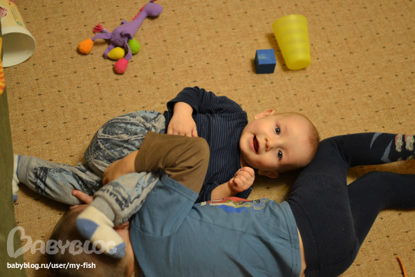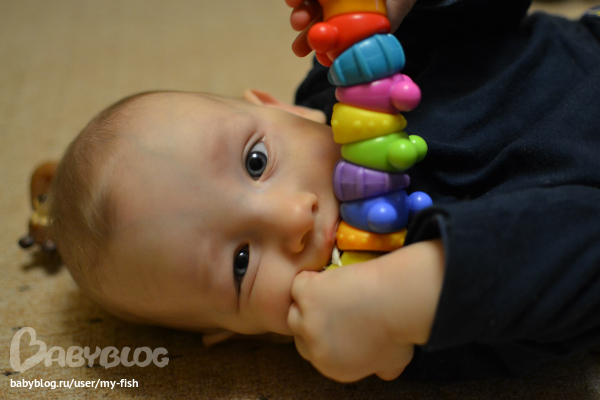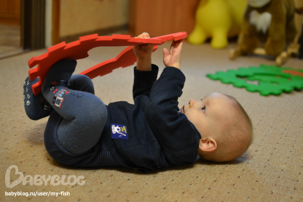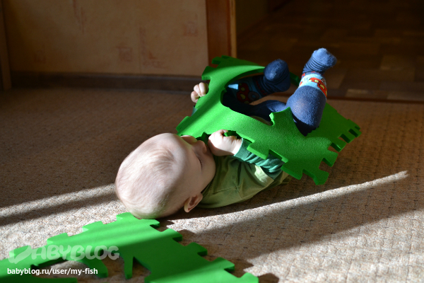 Максюха так же с ковриком-пазлом играет )) И зубов у нас тоже нет)