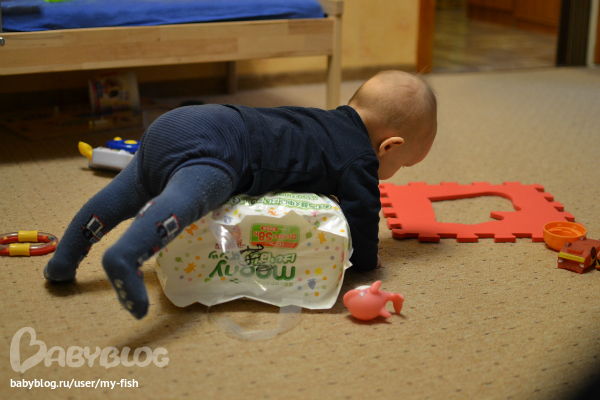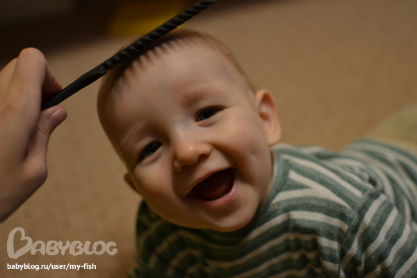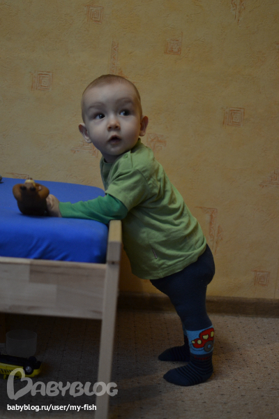 Вадимка разболтался, чего-то бурчит все время, смешной такой. Любит играть ложками, крышками от пюре, всякими баночками. Уже больше 2 недель встает на четвереньки, качается, но ползает все также на пузе, как метеор. Если я сижу рядом с ним на полу, то забирается по мне, как по елке, и встает. Любит стоять у кровати, играть с чем-нибудь, но долго я не даю этого делать. Зубов у Вадьки нету, только слюни :)))