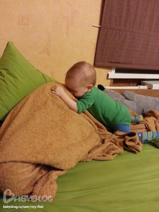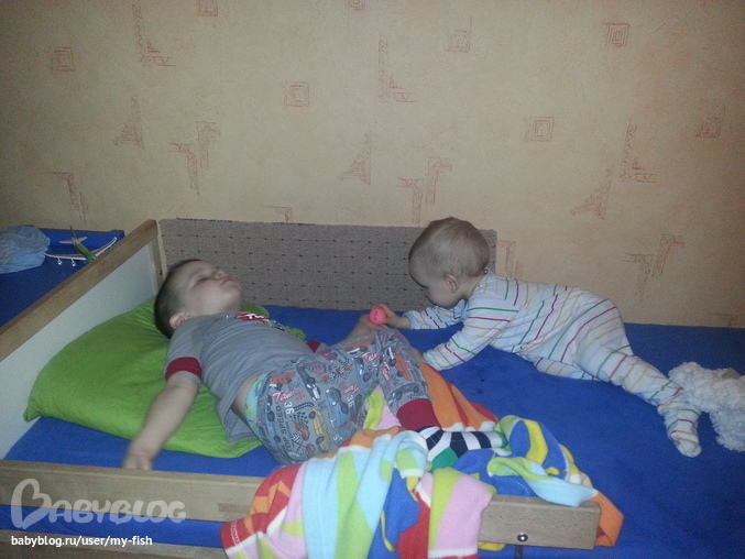про ВадимкуВремя 22:40. Тёма спит уже почти час, а Вадик никак не укладывается. Решила, ну что время терять, пошла в Тёмину комнату игрушки прибрать, само собой Вадимку прихватила с собой. Думала он поиграет минут 5, пока я быстренько наведу порядок. А он сразу залез к Тёме на кровать, трогал его спящего за уши, лицо, потом стал вкладывать ему в руку мячик для пинг-понга, приглашал играть, звал своим смешным "эх-эх". Так трогательно смотрелось ;)
