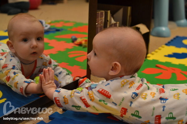Любит Вадим общаться со своим отражением. Подползет к зеркалу, чего-то там бурчит на своем, наглаживает отражение :)