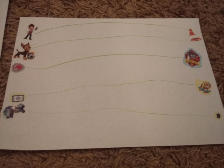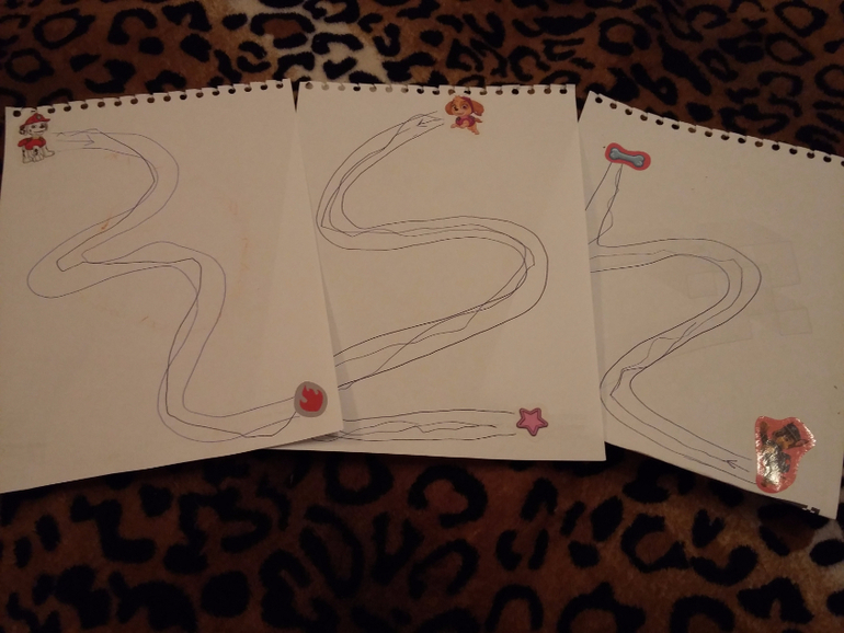 Клеим две наклейки в разных углах листа и рисуем дорожку. Ребенку нужно помочь герою добраться до косточки\звездочки.... Сначала дочь проводит пальчиком по дорожке. потом ручкой.