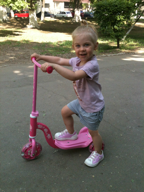 На самокате катается, а вот велик, не монстр управляшка, а обычный детский трех колесный ну никак не дается_))