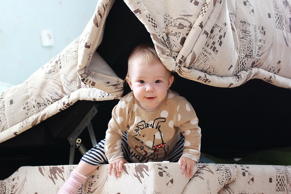 - забавно жмурится, сильно сжав веки, закрывает глаза кулачками типа "ку-ку";
