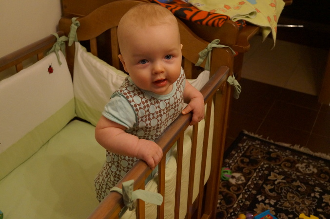 Последний раз в выходлные выносили всякий хлам в коридор,чтоб потом выкинуть.Саша был на полу,и чтоб его не просквозило закрыли дверь в комнату.А до двери барьер из диванных подушек. В общем,заняло это не более 2-х минут.Я тихонечко стала открывать дверь, видимо,боялась,вдруг дополз..и тут крик жуткий. я дверь закрыла,и ажно помертвела,Мужа зову,испугалась,вдруг пальчики ему прищемила..В общем пока дверь по миллиметру открывали ,я чуть не поседела. Оказываетсчя,Саша переполз барьеры,и видимо,стоял на ножках или коленках возле двери,а я его толкнула,он упал головой назад.Так плакал,мой бедняжка,слезы размазывая кулачками по личику.С тех пор я не выхожу почти ни на секунду из комнаты,если только он не спит.