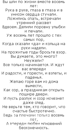 Вот добрались вы до «жести»,Восемь долгих лет вы вместе,Душа в душу, друг за другом,Муж — есть друг, жена — подруга,Жить вам так же много лет,В счастье, радости, без бед,Преуспеть и подниматься,Друг за друга лишь держаться,Детки будут пусть здоровы,Учатся отлично в школе!