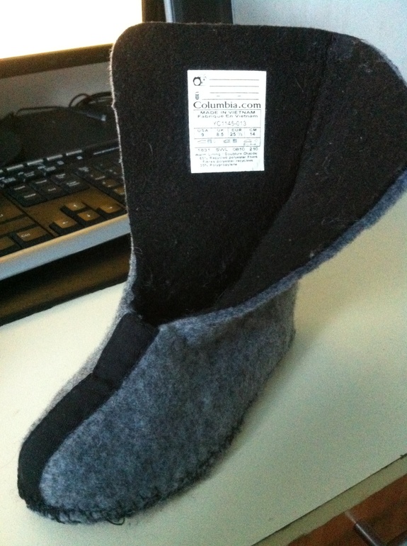 там толстый валенок.. Я вот подумала сейчас, как я выросла на севере без такой обуви..))))))))) Ходила даже в модельных сапогах на тонкой подошве гулять с коляской (Сережу я там родила и три первых его года еще там жили), гуляла два раза в день по часу-полтора. Да и в школу я никогда валенки не одела, даже в 1 классе (тогда валенки были самой теплой обувью), всегда сапожки (ботинки).. просто кожа с просто мехом)) А сюда переехала и в шоке как тут утепляют детей и себя.. через пару лет сама так делать стала)))) Сережа в шоке иногда с того, как я Арсюху утепляю))