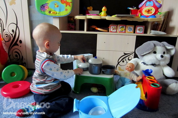 Еще мы теперь варим обеды и ужины папе. Он же голодный с работы приходит. У Ванюши есть детский набор кастрюлек и сковородок...варим суп с помидорами, жарим рыбу, и чай с лимонами завариваем. Самие любимое у нас занятие это резать овощи)))) Купили ему такой наборчик интересный. Там две половинки пластмассового лимона, соединенные липучкой, и такой же помидор, доска для резки и ножичек. Так теперь если Ваня притих на 10 минут, значит он режет помидорку)))))) Прикольно.