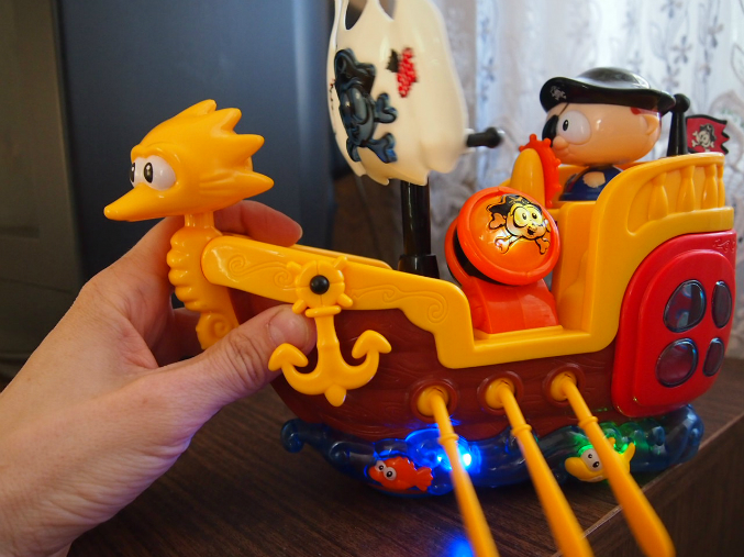 Обалденный корабль с музыкой,шумом волн и огнями,ездит по полу,кружится на месте,при наезде на снену разворачивается,супер игрушка!!! 900