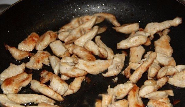 Сырое куриное филе нарезаем полосками и обжариваем на сковороде до золотистого цвета.Куриное филе нарезаем полосками и обжариваем на сковороде до золотистого цвета.Шампиньоны тщательно промываем. Кладём грибы в холодную воду, когда вода закипит уменьшаем огонь и отвариваем до готовности (приблизительно 8 - 10 минут). Затем разрезаем на 4 части. Шампиньоны отвариваем и разрезаем на 4 части. Пекинскую капусту мелко шинкуем.